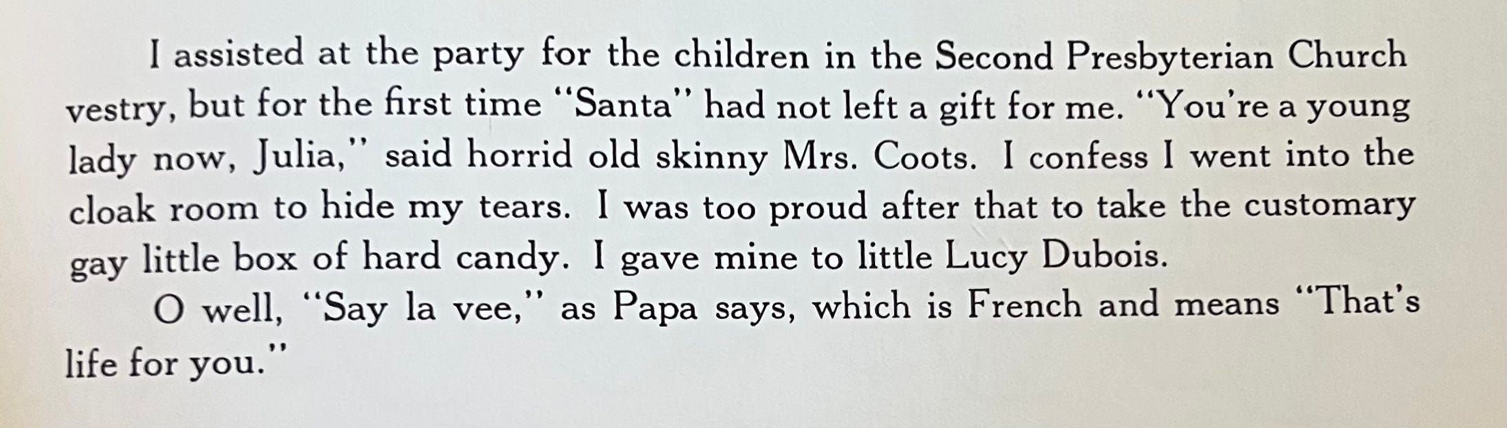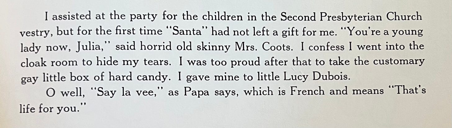 Papa’s response is much too harsh here. The answer to the disappointment of growing up is to make your own Christmas magic! I think Victorian adults knew this :)